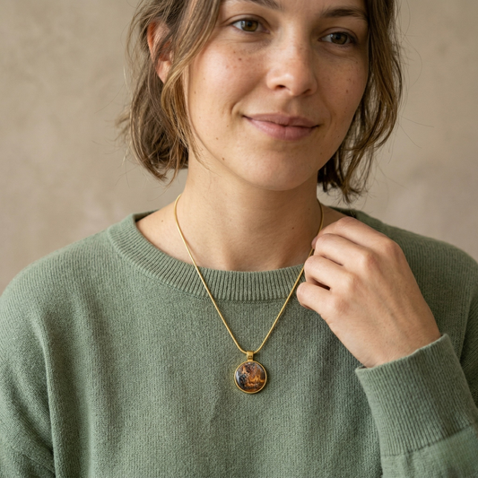 Ketting Juuls | rvs design hart met kleurenprint, zwart, goud, oker en een vleugje wit