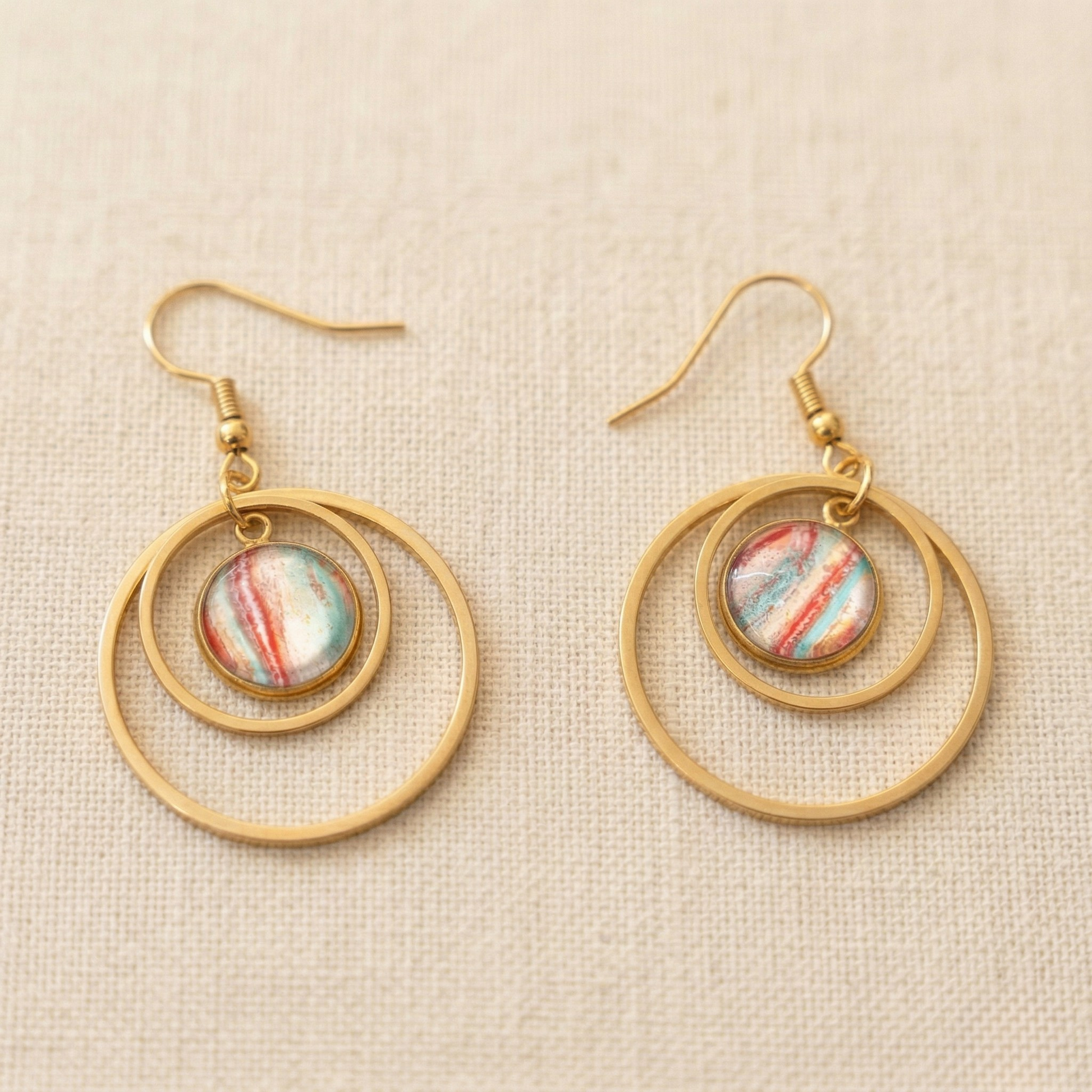 Oorbellen Puck | rvs design met dubbele ringen, turquoase, rood, wit